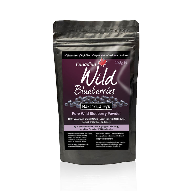 Bart 'n' Lainy's 100% Pure Canadian Wild Blueberry Powder. Great with porridge, yogurt, smoothies and more.... enjoy the famous "vaccinium angustifolium" variety, in a convenient powder with no additives whatsoever.