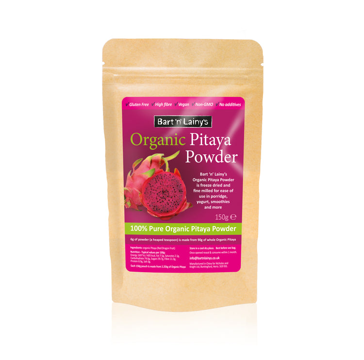 Bart 'n' Lainy's 100% Pure Organic Pitaya Powder (aka red dragon fruit) is freeze dried and fine milled for ease of use in porridge, yogurt, smoothies and more.